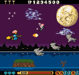 Though the original Cotton (which the NGP version is based on) is nearly 10 years old, the graphics you'll find here are quite nifty. The sprites are especially attractive - Cotton and Silk are detailed, richly colored (we're talking full color here), and animate really well for such small characters. Animated art screens used during intermissions are cool...and very wacky. The levels are well drawn and graphically varied, the best of which has to be the first. As you start the level, you'll immediately notice a sweet layer of parallax as the clouds and foreground scroll across a full moon backdrop. A really awesome effect, though it ultimately results in disappointment - it's the only level that uses parallax! Some later levels try to make up for it with animated elements like waterfalls, though it feels like more care was put into the earlier stages. Another odd occurrence is one I didn't expect, that being (gasp) sprite flicker/glitching. Now, before you panic, this isn't a very big deal - it only happens in two areas of the game (bosses who are otherwise alright), and it's over with very quickly. Overall, Cotton's graphics are above average.
