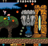 The basic gameplay structure is not unlike most shooters - fly along on your broomstick, blasting enemies with the help of Silk the fairy (who acts similarly to some weapon pod add-ons in R-Type and other shooters), trash a midboss, and then wrap things up with a final boss battle. Along the way you'll encounter crystals and other power-up items (well, just one other actually - the bomb power-up). If you pick up a crystal as you find it, your Exp. will be boosted, adding to your firepower. However, if you shoot it a little before swooping in for the pickup, it will be transformed into a magic attack. Each magic attack (either Dragon or Thunder) can be utilized by charging it for a few moments and then letting it loose on an enemy (preferably a boss), causing severe damage and providing a good deal of sadistic pleasure to the player. These power-ups are a load of fun to use, though a greater abundance and variety would have been nice. Deciding when to boost your shot power and when to pick up a magic attack can become an important strategy.
