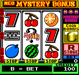 The main problem, really, was and is that each full-price casino cartridge only contains one game. Yep, when that title says "Pocket Casino Series: Neo Mystery Bonus," you're not gettin' no pocket casino, mysery explained. What you get is a slot machine simulator with some fancy bells and whistles. Other games in the series include more slot machine sims, video poker, blackjack/21, and a couple others that aren't officially part of the "Pocket Casino Series."