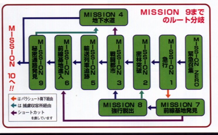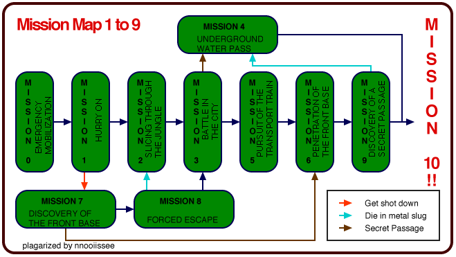 This level chart was originally published in Neo Geo Freak Magazine, and displays all possible routs through the level structure of Metal Slug: 1st Mission. It is in Japanese, but easy to understand simply by looking at the colored chart and level numbers. Click Here to download the scan.